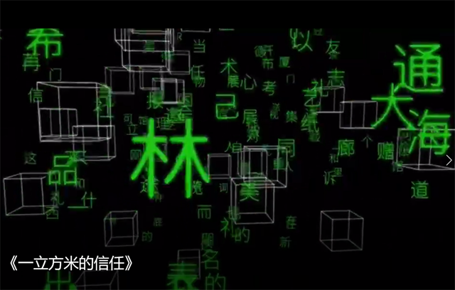 艺术家林苒,从2012年8月开始通过个人新浪微博,豆瓣网,厦门本土杂志,报纸,厦门卫视,上海当代艺术博物馆上海双年展,上海艺术门画廊展览,美国布罗德美术馆展览等渠道和途径向社会公开征集信任礼物。她邀请社会各界人士朋友们,赠送给她一件诉说自己对信任的理解和体验的礼物。这件信任礼物可以是任何一个东西,代表了不同的人心底里对这个名词的认知和体会。而她也希望大家在思考拿出什么物品的同时,能重新审视「信任」这个词。把288人的信任信件、声音、照片等写成智能合约做成《一立方米的信任》铸造在以太坊上生成数字艺术作品。